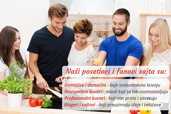 Posetioci i fanovi našeg sajta koriste: Sastojke potrebne za pripremu hraneZačine, testenine, mesne proizvode i prerađevine, mlečne proizvode i sireve, namaze, voće i povrće, pića... Razna kuhinjska pomagala i elementeŠporet, frižider, friteza, mikser, seckalica, kuvalo, rende.... Za pripremu hrane i serviranje oni koristeLonce, tiganje, kutlače, escajg, tanjire, činije... Garderobu i štitnikeKecelje, rukavice, kape ... Da bi počistili za sobom oni koristeRazna hemijska sredstva, žice, sunđere i krpe A kad nemaju vremena za kuvanje ili žele odmorNaši fanovi posećuju restorane i poručuju gotovu hranu |
